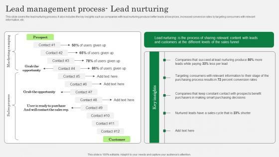 This slide covers the lead nurturing process. It also includes the key insights such as companies with lead nurturing produce better leads at low prices, increased conversion rates by targeting consumers with relevant information, etc. Slidegeeks has constructed Optimizing Client Lead Handling Lead Management Process Lead Nurturing Guidelines Pdf after conducting extensive research and examination. These presentation templates are constantly being generated and modified based on user preferences and critiques from editors. Here, you will find the most attractive templates for a range of purposes while taking into account ratings and remarks from users regarding the content. This is an excellent jumping-off point to explore our content and will give new users an insight into our top-notch PowerPoint Templates. This slide covers the lead nurturing process. It also includes the key insights such as companies with lead nurturing produce better leads at low prices, increased conversion rates by targeting consumers with relevant information, etc.