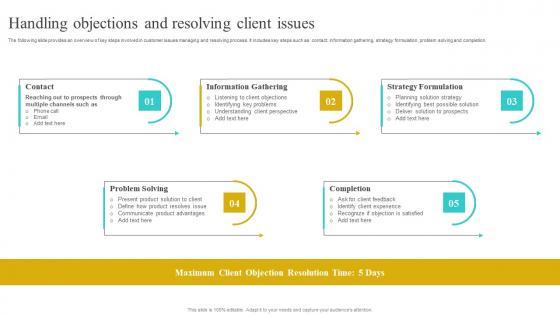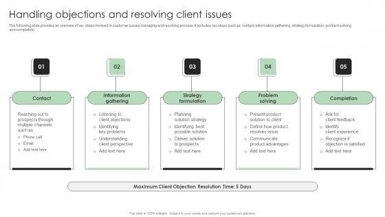 The following slide provides an overview of key steps involved in customer issues managing and resolving process. It includes key steps such as contact, information gathering, strategy formulation, problem solving and completion. Find a pre designed and impeccable Handling Objections And Resolving Client Issues Mockup PDF. The templates can ace your presentation without additional effort. You can download these easy to edit presentation templates to make your presentation stand out from others. So, what are you waiting for Download the template from Slidegeeks today and give a unique touch to your presentation.