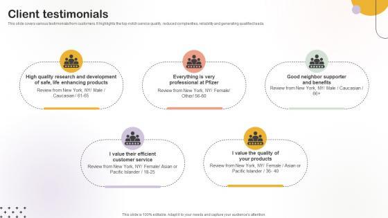 This slide covers various testimonials from customers. It highlights the top-notch service quality, products and brand reliability and helps in generating qualified leads. Create an editable Client Testimonials Biopharma Research Organization Pitch Deck that communicates your idea and engages your audience. Whether you are presenting a business or an educational presentation, pre-designed presentation templates help save time. Client Testimonials Biopharma Research Organization Pitch Deck is highly customizable and very easy to edit, covering many different styles from creative to business presentations. Slidegeeks has creative team members who have crafted amazing templates. So, go and get them without any delay. This slide covers various testimonials from customers. It highlights the top-notch service quality, products and brand reliability and helps in generating qualified leads.