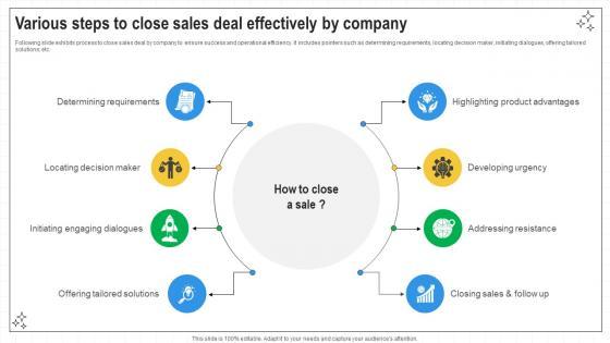 Following slide exhibits process to close sales deal by company to ensure success and operational efficiency. It includes pointers such as determining requirements, locating decision maker, initiating dialogues, offering tailored solutions, etc. If you are looking for a format to display your unique thoughts, then the professionally designed Closing Techniques To Seal Various Steps To Close Sales Deal Effectively By SA SS V is the one for you. You can use it as a Google Slides template or a PowerPoint template. Incorporate impressive visuals, symbols, images, and other charts. Modify or reorganize the text boxes as you desire. Experiment with shade schemes and font pairings. Alter, share or cooperate with other people on your work. Download Closing Techniques To Seal Various Steps To Close Sales Deal Effectively By SA SS V and find out how to give a successful presentation. Present a perfect display to your team and make your presentation unforgettable. Following slide exhibits process to close sales deal by company to ensure success and operational efficiency. It includes pointers such as determining requirements, locating decision maker, initiating dialogues, offering tailored solutions, etc.