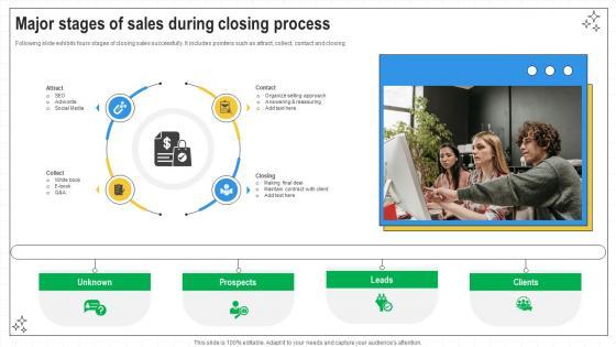 Following slide exhibits fours stages of closing sales successfully. It includes pointers such as attract, collect, contact and closing Welcome to our selection of the Closing Techniques To Seal Major Stages Of Sales During Closing Process SA SS V. These are designed to help you showcase your creativity and bring your sphere to life. Planning and Innovation are essential for any business that is just starting out. This collection contains the designs that you need for your everyday presentations. All of our PowerPoints are 100Percent editable, so you can customize them to suit your needs. This multi-purpose template can be used in various situations. Grab these presentation templates today. Following slide exhibits fours stages of closing sales successfully. It includes pointers such as attract, collect, contact and closing