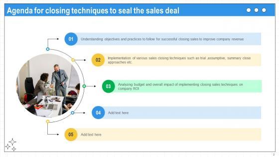 Find a pre-designed and impeccable Agenda For Closing Techniques To Seal The Sales Deal SA SS V. The templates can ace your presentation without additional effort. You can download these easy-to-edit presentation templates to make your presentation stand out from others. So, what are you waiting for Download the template from Slidegeeks today and give a unique touch to your presentation. Our Agenda For Closing Techniques To Seal The Sales Deal SA SS V are topically designed to provide an attractive backdrop to any subject. Use them to look like a presentation pro.