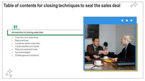 Crafting an eye-catching presentation has never been more straightforward. Let your presentation shine with this tasteful yet straightforward Table Of Contents Closing Techniques To Seal The Sales Deal SA SS V template. It offers a minimalistic and classy look that is great for making a statement. The colors have been employed intelligently to add a bit of playfulness while still remaining professional. Construct the ideal Table Of Contents Closing Techniques To Seal The Sales Deal SA SS V that effortlessly grabs the attention of your audience Begin now and be certain to wow your customers Our Table Of Contents Closing Techniques To Seal The Sales Deal SA SS V are topically designed to provide an attractive backdrop to any subject. Use them to look like a presentation pro.