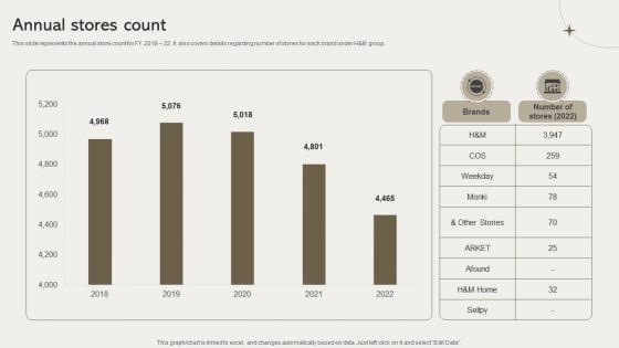 This slide represents the annual store count for FY 2018 22. It also covers details regarding number of stores for each brand under HandM group. Find a pre-designed and impeccable Annual Stores Count Clothing Retailer Company Profile CP SS V. The templates can ace your presentation without additional effort. You can download these easy-to-edit presentation templates to make your presentation stand out from others. So, what are you waiting for Download the template from Slidegeeks today and give a unique touch to your presentation. This slide represents the annual store count for FY 2018 22. It also covers details regarding number of stores for each brand under HandM group.