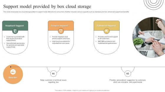 This slide showcases box cloud storage platform support model offered to its consumers. It further includes various supports such as standard, premier, enhanced support and benefits. Whether you have daily or monthly meetings, a brilliant presentation is necessary. Support Model Provided By Box Cloud Storage Ultimate Guide To Adopt Box Background PDF can be your best option for delivering a presentation. Represent everything in detail using Support Model Provided By Box Cloud Storage Ultimate Guide To Adopt Box Background PDF and make yourself stand out in meetings. The template is versatile and follows a structure that will cater to your requirements. All the templates prepared by Slidegeeks are easy to download and edit. Our research experts have taken care of the corporate themes as well. So, give it a try and see the results. This slide showcases box cloud storage platform support model offered to its consumers. It further includes various supports such as standard, premier, enhanced support and benefits.