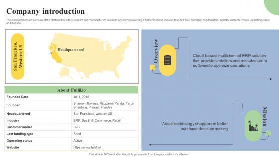This slide provides an overview of the platform that offers retailers and manufacturers solutions for seamless working. It further includes mission, founded date, founders, headquarters, industry, customer model, operating status and website. Slidegeeks is one of the best resources for PowerPoint templates. You can download easily and regulate Company Introduction Cloud Based ERP Software Investor Financing Elevator Pitch Deck Summary Pdf for your personal presentations from our wonderful collection. A few clicks is all it takes to discover and get the most relevant and appropriate templates. Use our Templates to add a unique zing and appeal to your presentation and meetings. All the slides are easy to edit and you can use them even for advertisement purposes. This slide provides an overview of the platform that offers retailers and manufacturers solutions for seamless working. It further includes mission, founded date, founders, headquarters, industry, customer model, operating status and website.