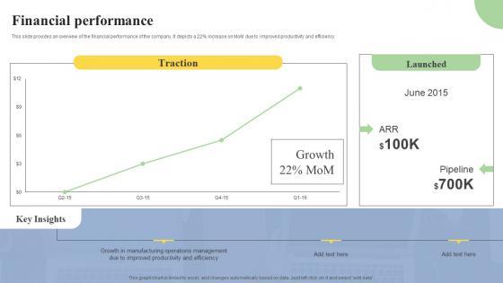 This slide provides an overview of the financial performance of the company. It depicts a 22percent increase on MoM due to improved productivity and efficiency From laying roadmaps to briefing everything in detail, our templates are perfect for you. You can set the stage with your presentation slides. All you have to do is download these easy to edit and customizable templates. Financial Performance Cloud Based ERP Software Investor Financing Elevator Pitch Deck Formats Pdf will help you deliver an outstanding performance that everyone would remember and praise you for. Do download this presentation today. This slide provides an overview of the financial performance of the company. It depicts a 22percent increase on MoM due to improved productivity and efficiency