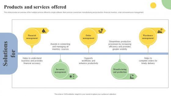 This slide provides an overview of the multiple services offered by single software. Main services covered are manufacturing and production, financial, inventory, order and warehouse management. Formulating a presentation can take up a lot of effort and time, so the content and message should always be the primary focus. The visuals of the PowerPoint can enhance the presenters message, so our Products Services Cloud Based ERP Software Investor Financing Elevator Pitch Deck Template Pdf was created to help save time. Instead of worrying about the design, the presenter can concentrate on the message while our designers work on creating the ideal templates for whatever situation is needed. Slidegeeks has experts for everything from amazing designs to valuable content, we have put everything into Products Services Cloud Based ERP Software Investor Financing Elevator Pitch Deck Template Pdf This slide provides an overview of the multiple services offered by single software. Main services covered are manufacturing and production, financial, inventory, order and warehouse management.