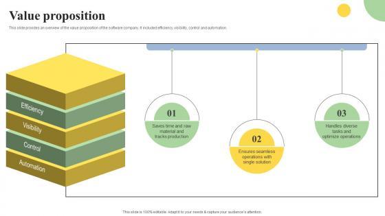 This slide provides an overview of the value proposition of the software company. It included efficiency, visibility, control and automation. The best PPT templates are a great way to save time, energy, and resources. Slidegeeks have 100 percent editable powerpoint slides making them incredibly versatile. With these quality presentation templates, you can create a captivating and memorable presentation by combining visually appealing slides and effectively communicating your message. Download Value Proposition Cloud Based ERP Software Investor Financing Elevator Pitch Deck Diagrams Pdf from Slidegeeks and deliver a wonderful presentation. This slide provides an overview of the value proposition of the software company. It included efficiency, visibility, control and automation.