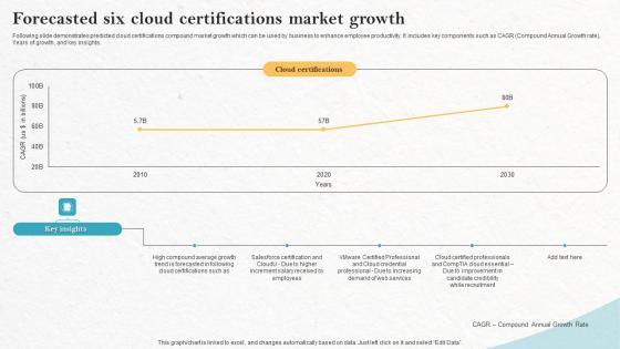 Following slide demonstrates predicted cloud certifications compound market growth which can be used by business to enhance employee productivity. It includes key components such as CAGR Compound Annual Growth rate, Years of growth, and key insights. Showcasing this set of slides titled Forecasted Six Cloud Certifications Market Growth Elements Pdf. The topics addressed in these templates are Forecasted Six Cloud, Certifications Market Growth, Compound Annual Growth Rate. All the content presented in this PPT design is completely editable. Download it and make adjustments in color, background, font etc. as per your unique business setting. Following slide demonstrates predicted cloud certifications compound market growth which can be used by business to enhance employee productivity. It includes key components such as CAGR Compound Annual Growth rate, Years of growth, and key insights.