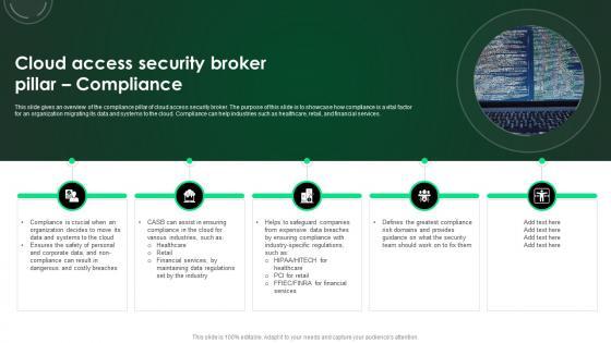 This slide gives an overview of the compliance pillar of cloud access security broker. The purpose of this slide is to showcase how compliance is a vital factor for an organization migrating its data and systems to the cloud. Compliance can help industries such as healthcare, retail, and financial services. The best PPT templates are a great way to save time, energy, and resources. Slidegeeks have 100 percent editable powerpoint slides making them incredibly versatile. With these quality presentation templates, you can create a captivating and memorable presentation by combining visually appealing slides and effectively communicating your message. Download CASB 2 0 IT Cloud Access Security Broker Pillar Compliance from Slidegeeks and deliver a wonderful presentation. This slide gives an overview of the compliance pillar of cloud access security broker. The purpose of this slide is to showcase how compliance is a vital factor for an organization migrating its data and systems to the cloud. Compliance can help industries such as healthcare, retail, and financial services.