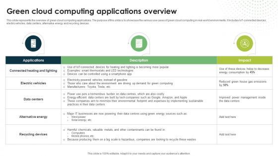 This slide represents the overview of green cloud computing applications. The purpose of this slide is to showcase the various use cases of green cloud computing in real-world environments. It includes IoT-connected devices, electric vehicles, data centers, alternative energy and recycling devices.If your project calls for a presentation, then Slidegeeks is your go-to partner because we have professionally designed, easy-to-edit templates that are perfect for any presentation. After downloading, you can easily edit Green Cloud Computing Applications Overview Eco Friendly Computing IT and make the changes accordingly. You can rearrange slides or fill them with different images. Check out all the handy templates This slide represents the overview of green cloud computing applications. The purpose of this slide is to showcase the various use cases of green cloud computing in real-world environments. It includes IoT-connected devices, electric vehicles, data centers, alternative energy and recycling devices.