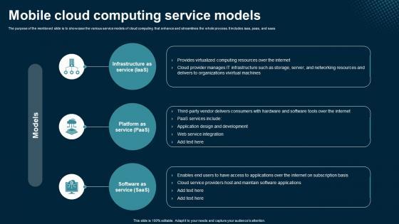 The purpose of the mentioned slide is to showcase the various service models of cloud computing that enhance and streamlines the whole process. It includes iaas, paas, and saas. Here you can discover an assortment of the finest PowerPoint and Google Slides templates. With these templates, you can create presentations for a variety of purposes while simultaneously providing your audience with an eye-catching visual experience. Download Mobile Cloud Computing Service Models Application Areas Of Mobile Cloud Computing to deliver an impeccable presentation. These templates will make your job of preparing presentations much quicker, yet still, maintain a high level of quality. Slidegeeks has experienced researchers who prepare these templates and write high-quality content for you. Later on, you can personalize the content by editing the Mobile Cloud Computing Service Models Application Areas Of Mobile Cloud Computing. The purpose of the mentioned slide is to showcase the various service models of cloud computing that enhance and streamlines the whole process. It includes iaas, paas, and saas