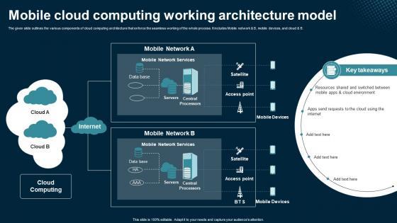 The given slide outlines the various components of cloud computing architecture that enforce the seamless working of the whole process. It includes Mobile network and B, mobile devices, and cloud and B. Do you know about Slidesgeeks Mobile Cloud Computing Working Architecture Model Application Areas Of Mobile Cloud Computing These are perfect for delivering any kind od presentation. Using it, create PowerPoint presentations that communicate your ideas and engage audiences. Save time and effort by using our pre-designed presentation templates that are perfect for a wide range of topic. Our vast selection of designs covers a range of styles, from creative to business, and are all highly customizable and easy to edit. Download as a PowerPoint template or use them as Google Slides themes. The given slide outlines the various components of cloud computing architecture that enforce the seamless working of the whole process. It includes Mobile network and B, mobile devices, and cloud and B.