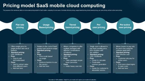 The purpose of the mentioned slide is to showcase pricing model for SaaS mobile computing for end-users. It includes flat rate pricing, usage-based pricing, tiered-based pricing, per-user pricing, and per active user pricing. Presenting this PowerPoint presentation, titled Pricing Model SaaS Mobile Cloud Computing Application Areas Of Mobile Cloud Computing, with topics curated by our researchers after extensive research. This editable presentation is available for immediate download and provides attractive features when used. Download now and captivate your audience. Presenting this Pricing Model SaaS Mobile Cloud Computing Application Areas Of Mobile Cloud Computing. Our researchers have carefully researched and created these slides with all aspects taken into consideration. This is a completely customizable Pricing Model SaaS Mobile Cloud Computing Application Areas Of Mobile Cloud Computing that is available for immediate downloading. Download now and make an impact on your audience. Highlight the attractive features available with our PPTs. The purpose of the mentioned slide is to showcase pricing model for SaaS mobile computing for end-users. It includes flat rate pricing, usage-based pricing, tiered-based pricing, per-user pricing, and per active user pricing