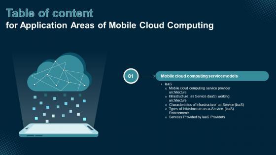 This Table Of Contents For Application Areas Of Mobile Cloud Computing Ppt Information is perfect for any presentation, be it in front of clients or colleagues. It is a versatile and stylish solution for organizing your meetings. The Table Of Contents For Application Areas Of Mobile Cloud Computing Ppt Information features a modern design for your presentation meetings. The adjustable and customizable slides provide unlimited possibilities for acing up your presentation. Slidegeeks has done all the homework before launching the product for you. So, do not wait, grab the presentation templates today Our Table Of Contents For Application Areas Of Mobile Cloud Computing Ppt Information are topically designed to provide an attractive backdrop to any subject. Use them to look like a presentation pro.
