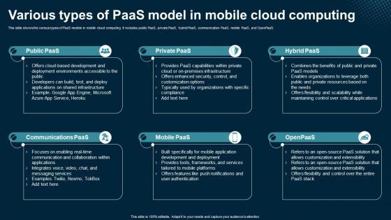 This slide shows the various types of PaaS models in mobile cloud computing. It includes public PaaS, private PaaS, hybrid PaaS, communication PaaS, mobile PaaS, and OpenPaaS. The best PPT templates are a great way to save time, energy, and resources. Slidegeeks have 100 percent editable powerpoint slides making them incredibly versatile. With these quality presentation templates, you can create a captivating and memorable presentation by combining visually appealing slides and effectively communicating your message. Download Various Types Of PaaS Model In Mobile Cloud Application Areas Of Mobile Cloud Computing from Slidegeeks and deliver a wonderful presentation. This slide shows the various types of PaaS models in mobile cloud computing. It includes public PaaS, private PaaS, hybrid PaaS, communication PaaS, mobile PaaS, and OpenPaaS.
