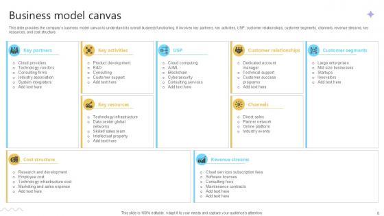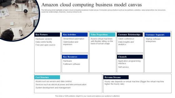This slide provides the companys business model canvas to understand its overall business functioning. It involves key partners, key activities, USP, customer relationships, customer segments, channels, revenue streams, key resources, and cost structure. Find a pre-designed and impeccable Business Model Canvas Cloud Computing Services Business Model PPT Sample. The templates can ace your presentation without additional effort. You can download these easy-to-edit presentation templates to make your presentation stand out from others. So, what are you waiting for Download the template from Slidegeeks today and give a unique touch to your presentation. This slide provides the companys business model canvas to understand its overall business functioning. It involves key partners, key activities, USP, customer relationships, customer segments, channels, revenue streams, key resources, and cost structure.