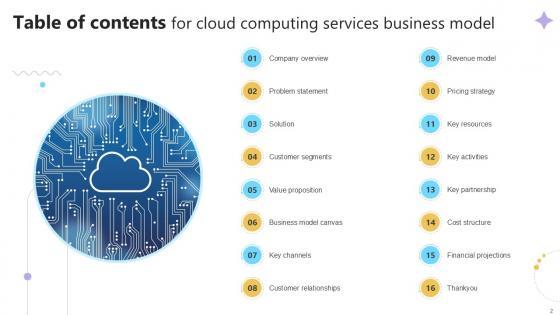 If you are looking for a format to display your unique thoughts, then the professionally designed Table Of Contents For Cloud Computing Services Business Model PPT PowerPoint is the one for you. You can use it as a Google Slides template or a PowerPoint template. Incorporate impressive visuals, symbols, images, and other charts. Modify or reorganize the text boxes as you desire. Experiment with shade schemes and font pairings. Alter, share or cooperate with other people on your work. Download Table Of Contents For Cloud Computing Services Business Model PPT PowerPoint and find out how to give a successful presentation. Present a perfect display to your team and make your presentation unforgettable. Our Table Of Contents For Cloud Computing Services Business Model PPT PowerPoint BMC SS V are topically designed to provide an attractive backdrop to any subject. Use them to look like a presentation pro.