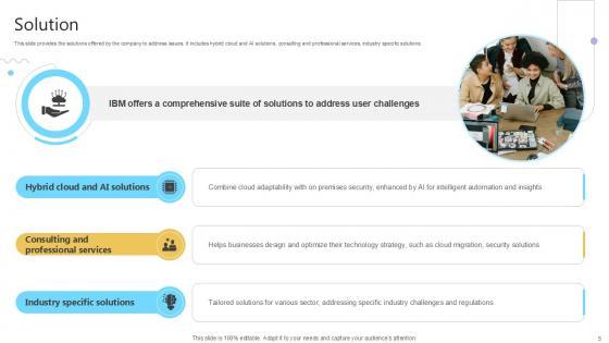 This slide provides the solutions offered by the company to address issues. It includes hybrid cloud and AI solutions, consulting and professional services, industry specific solutions. If your project calls for a presentation, then Slidegeeks is your go-to partner because we have professionally designed, easy-to-edit templates that are perfect for any presentation. After downloading, you can easily edit Solution Cloud Computing Services Business Model PPT Example and make the changes accordingly. You can rearrange slides or fill them with different images. Check out all the handy templates This slide provides the solutions offered by the company to address issues. It includes hybrid cloud and AI solutions, consulting and professional services, industry specific solutions.