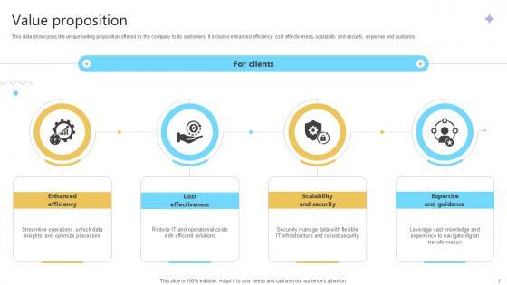 This slide showcases the unique selling proposition offered by the company to its customers. It includes enhanced efficiency, cost effectiveness, scalability and security, expertise and guidance. Are you in need of a template that can accommodate all of your creative concepts This one is crafted professionally and can be altered to fit any style. Use it with Google Slides or PowerPoint. Include striking photographs, symbols, depictions, and other visuals. Fill, move around, or remove text boxes as desired. Test out color palettes and font mixtures. Edit and save your work, or work with colleagues. Download Value Proposition Cloud Computing Services Business Model PPT PowerPoint and observe how to make your presentation outstanding. Give an impeccable presentation to your group and make your presentation unforgettable. This slide showcases the unique selling proposition offered by the company to its customers. It includes enhanced efficiency, cost effectiveness, scalability and security, expertise and guidance.