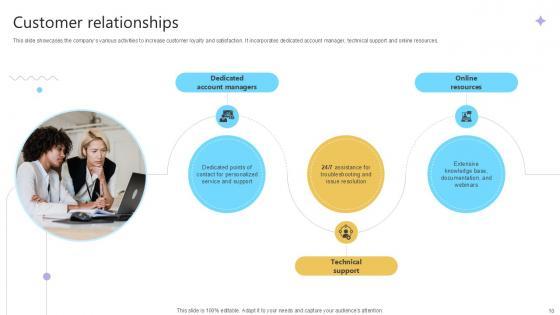 This slide showcases the companys various activities to increase customer loyalty and satisfaction. It incorporates dedicated account manager, technical support and online resources. Slidegeeks is one of the best resources for PowerPoint templates. You can download easily and regulate Customer Relationships Cloud Computing Services Business Model PPT PowerPoint for your personal presentations from our wonderful collection. A few clicks is all it takes to discover and get the most relevant and appropriate templates. Use our Templates to add a unique zing and appeal to your presentation and meetings. All the slides are easy to edit and you can use them even for advertisement purposes. This slide showcases the companys various activities to increase customer loyalty and satisfaction. It incorporates dedicated account manager, technical support and online resources.