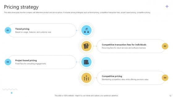 This slide showcases how the company will determine product and service prices. It includes pricing strategies such as tiered pricing, competitive transaction fees, project based pricing, competitive pricing. Do you have an important presentation coming up Are you looking for something that will make your presentation stand out from the rest Look no further than Pricing Strategy Cloud Computing Services Business Model PPT Presentation. With our professional designs, you can trust that your presentation will pop and make delivering it a smooth process. And with Slidegeeks, you can trust that your presentation will be unique and memorable. So why wait Grab Pricing Strategy Cloud Computing Services Business Model PPT Presentation today and make your presentation stand out from the rest This slide showcases how the company will determine product and service prices. It includes pricing strategies such as tiered pricing, competitive transaction fees, project based pricing, competitive pricing.