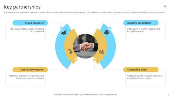 This slide showcases the essential relationship a company needs to function effectively in all areas of the business model. It includes partnerships with cloud providers, technology vendors, consulting firms, industry associations. Present like a pro with Key Partnerships Cloud Computing Services Business Model PPT Sample. Create beautiful presentations together with your team, using our easy-to-use presentation slides. Share your ideas in real-time and make changes on the fly by downloading our templates. So whether you are in the office, on the go, or in a remote location, you can stay in sync with your team and present your ideas with confidence. With Slidegeeks presentation got a whole lot easier. Grab these presentations today. This slide showcases the essential relationship a company needs to function effectively in all areas of the business model. It includes partnerships with cloud providers, technology vendors, consulting firms, industry associations.