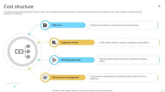 This slide showcases all the expenses and costs a company incurs to operate its business successfully. It includes costs such as research and development cost, employee salaries, marketing and sales, infrastructure management. Create an editable Cost Structure Cloud Computing Services Business Model PPT Sample that communicates your idea and engages your audience. Whether you are presenting a business or an educational presentation, pre-designed presentation templates help save time. Cost Structure Cloud Computing Services Business Model PPT Sample is highly customizable and very easy to edit, covering many different styles from creative to business presentations. Slidegeeks has creative team members who have crafted amazing templates. So, go and get them without any delay. This slide showcases all the expenses and costs a company incurs to operate its business successfully. It includes costs such as research and development cost, employee salaries, marketing and sales, infrastructure management.