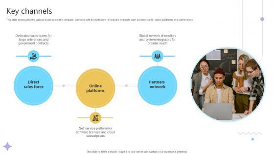 This slide showcases the various touch points the company connects with its customers. It includes channels such as direct sales, online platforms and partnerships. From laying roadmaps to briefing everything in detail, our templates are perfect for you. You can set the stage with your presentation slides. All you have to do is download these easy-to-edit and customizable templates. Key Channels Cloud Computing Services Business Model PPT Slide will help you deliver an outstanding performance that everyone would remember and praise you for. Do download this presentation today. This slide showcases the various touch points the company connects with its customers. It includes channels such as direct sales, online platforms and partnerships.