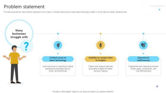 This slide showcases the major problems addressed by the company. It includes limited access to edge cutting technologies, inability to convert data into insights, operational silos. Whether you have daily or monthly meetings, a brilliant presentation is necessary. Problem Statement Cloud Computing Services Business Model PPT Presentation can be your best option for delivering a presentation. Represent everything in detail using Problem Statement Cloud Computing Services Business Model PPT Presentation and make yourself stand out in meetings. The template is versatile and follows a structure that will cater to your requirements. All the templates prepared by Slidegeeks are easy to download and edit. Our research experts have taken care of the corporate themes as well. So, give it a try and see the results. This slide showcases the major problems addressed by the company. It includes limited access to edge cutting technologies, inability to convert data into insights, operational silos.