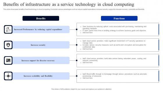 This slide showcases benefits of IaaS technology in cloud computing. It includes various advantages such as reduce capital expenditure, increase security, support for disaster recovery, scalability and flexibility. Pitch your topic with ease and precision using this Benefits Of Infrastructure As A Service Technology In Cloud Computing Infographics Pdf. This layout presents information on Capital Expenditure, Increase Security, Support Disaster Recovery. It is also available for immediate download and adjustment. So, changes can be made in the color, design, graphics or any other component to create a unique layout. This slide showcases benefits of IaaS technology in cloud computing. It includes various advantages such as reduce capital expenditure, increase security, support for disaster recovery, scalability and flexibility.