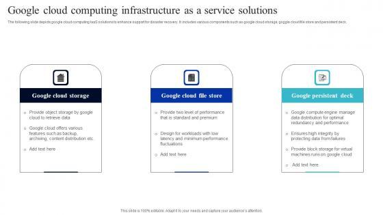 The following slide depicts google cloud computing IaaS solutions to enhance support for disaster recovery. It includes various components such as google cloud storage, goggle cloud file store and persistent deck. Pitch your topic with ease and precision using this Google Cloud Computing Infrastructure As A Service Solutions Professional Pdf. This layout presents information on Google Cloud Storage, Google Cloud, File Store, Google Persistent Deck. It is also available for immediate download and adjustment. So, changes can be made in the color, design, graphics or any other component to create a unique layout. The following slide depicts google cloud computing IaaS solutions to enhance support for disaster recovery. It includes various components such as google cloud storage, goggle cloud file store and persistent deck.