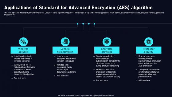 This slide represents the uses of Standard for Advanced Encryption AES algorithm. The purpose of this slide is to explain the various applications of AES technique such as wireless security, encrypted browsing, general file encryption, etc. If your project calls for a presentation, then Slidegeeks is your go to partner because we have professionally designed, easy to edit templates that are perfect for any presentation. After downloading, you can easily edit Applications Of Standard Advanced Cloud Data Security Using Cryptography Topics Pdf and make the changes accordingly. You can rearrange slides or fill them with different images. Check out all the handy templates This slide represents the uses of Standard for Advanced Encryption AES algorithm. The purpose of this slide is to explain the various applications of AES technique such as wireless security, encrypted browsing, general file encryption, etc.