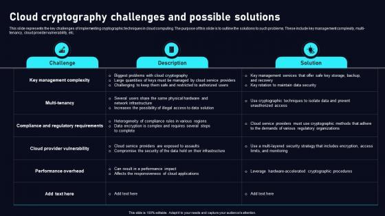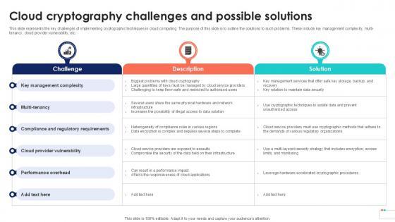 This slide represents the key challenges of implementing cryptographic techniques in cloud computing. The purpose of this slide is to outline the solutions to such problems. These include key management complexity, multi-tenancy, cloud provider vulnerability, etc. Find highly impressive Cloud Cryptography Challenges Data Security In Cloud Computing Ppt Slide on Slidegeeks to deliver a meaningful presentation. You can save an ample amount of time using these presentation templates. No need to worry to prepare everything from scratch because Slidegeeks experts have already done a huge research and work for you. You need to download Cloud Cryptography Challenges Data Security In Cloud Computing Ppt Slide for your upcoming presentation. All the presentation templates are 100 percent editable and you can change the color and personalize the content accordingly. Download now This slide represents the key challenges of implementing cryptographic techniques in cloud computing. The purpose of this slide is to outline the solutions to such problems. These include key management complexity, multi-tenancy, cloud provider vulnerability, etc.