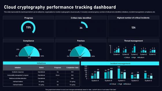 This slide represents the dashboard which can be utilized by organization to monitor cryptographic cloud security. It includes overall progress, number of critical risks identified, initiatives, incident management, compliance, etc. If you are looking for a format to display your unique thoughts, then the professionally designed Cloud Cryptography Performance Data Security In Cloud Computing Ppt Presentation is the one for you. You can use it as a Google Slides template or a PowerPoint template. Incorporate impressive visuals, symbols, images, and other charts. Modify or reorganize the text boxes as you desire. Experiment with shade schemes and font pairings. Alter, share or cooperate with other people on your work. Download Cloud Cryptography Performance Data Security In Cloud Computing Ppt Presentation and find out how to give a successful presentation. Present a perfect display to your team and make your presentation unforgettable. This slide represents the dashboard which can be utilized by organization to monitor cryptographic cloud security. It includes overall progress, number of critical risks identified, initiatives, incident management, compliance, etc.