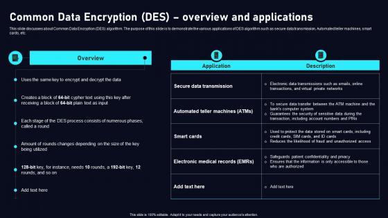 This slide discusses about Common Data Encryption DES algorithm. The purpose of this slide is to demonstrate the various applications of DES algorithm such as secure data transmission, Automated teller machines, smart cards, etc. Welcome to our selection of the Common Data Encryption Des Cloud Data Security Using Cryptography Slides Pdf. These are designed to help you showcase your creativity and bring your sphere to life. Planning and Innovation are essential for any business that is just starting out. This collection contains the designs that you need for your everyday presentations. All of our PowerPoints are 100 percent editable, so you can customize them to suit your needs. This multi purpose template can be used in various situations. Grab these presentation templates today This slide discusses about Common Data Encryption DES algorithm. The purpose of this slide is to demonstrate the various applications of DES algorithm such as secure data transmission, Automated teller machines, smart cards, etc.