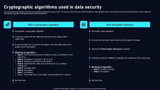 This slide talks about algorithms used for implementing cryptography in data security. The purpose of this slide is to explain the different implementation steps. The techniques discussed are RSA Rivest, Shamir, Adleman cryptographic algorithm and Data Encryption Standard algorithm. The best PPT templates are a great way to save time, energy, and resources. Slidegeeks have 100 percent editable powerpoint slides making them incredibly versatile. With these quality presentation templates, you can create a captivating and memorable presentation by combining visually appealing slides and effectively communicating your message. Download Cryptographic Algorithms Used In Cloud Data Security Using Cryptography Themes Pdf from Slidegeeks and deliver a wonderful presentation. This slide talks about algorithms used for implementing cryptography in data security. The purpose of this slide is to explain the different implementation steps. The techniques discussed are RSA Rivest, Shamir, Adleman cryptographic algorithm and Data Encryption Standard algorithm.