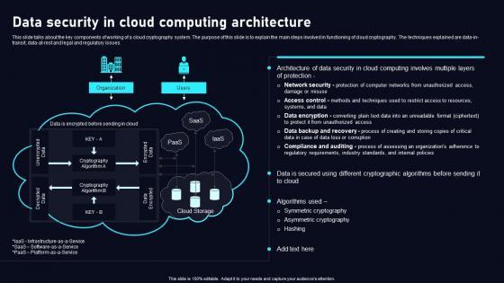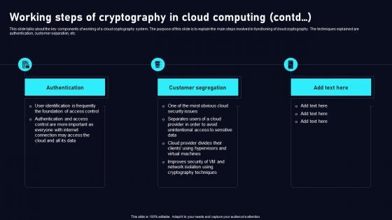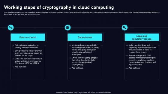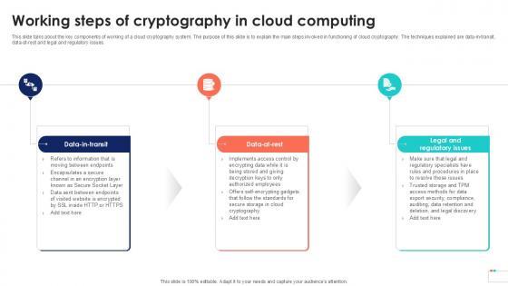 This slide talks about the key components of working of a cloud cryptography system. The purpose of this slide is to explain the main steps involved in functioning of cloud cryptography. The techniques explained are data-in-transit, data-at-rest and legal and regulatory issues. Coming up with a presentation necessitates that the majority of the effort goes into the content and the message you intend to convey. The visuals of a PowerPoint presentation can only be effective if it supplements and supports the story that is being told. Keeping this in mind our experts created Working Steps Of Cryptography Data Security In Cloud Computing Ppt Slide to reduce the time that goes into designing the presentation. This way, you can concentrate on the message while our designers take care of providing you with the right template for the situation. This slide talks about the key components of working of a cloud cryptography system. The purpose of this slide is to explain the main steps involved in functioning of cloud cryptography. The techniques explained are data-in-transit, data-at-rest and legal and regulatory issues.