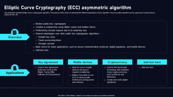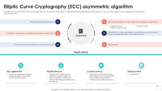 This slide talks about the Elliptic Curve Cryptography algorithm. The purpose of this slide is to elaborate the different applications of ECC algorithm. The uses of this algorithm are key agreement, mobile devices, cryptocurrency, etc. Welcome to our selection of the Elliptic Curve Cryptography ECC Data Security In Cloud Computing Ppt Template. These are designed to help you showcase your creativity and bring your sphere to life. Planning and Innovation are essential for any business that is just starting out. This collection contains the designs that you need for your everyday presentations. All of our PowerPoints are 100Percent editable, so you can customize them to suit your needs. This multi-purpose template can be used in various situations. Grab these presentation templates today. This slide talks about the Elliptic Curve Cryptography algorithm. The purpose of this slide is to elaborate the different applications of ECC algorithm. The uses of this algorithm are key agreement, mobile devices, cryptocurrency, etc.