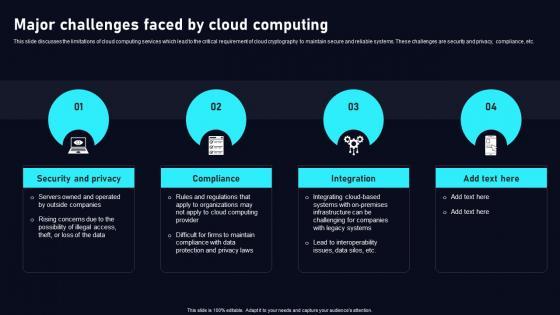 This slide discusses the limitations of cloud computing services which lead to the critical requirement of cloud cryptography to maintain secure and reliable systems. These challenges are security and privacy, compliance, etc. QThere are so many reasons you need a Major Challenges Faced By Cloud Data Security Using Cryptography Inspiration Pdf. The first reason is you can not spend time making everything from scratch, Thus, Slidegeeks has made presentation templates for you too. You can easily download these templates from our website easily. This slide discusses the limitations of cloud computing services which lead to the critical requirement of cloud cryptography to maintain secure and reliable systems. These challenges are security and privacy, compliance, etc.