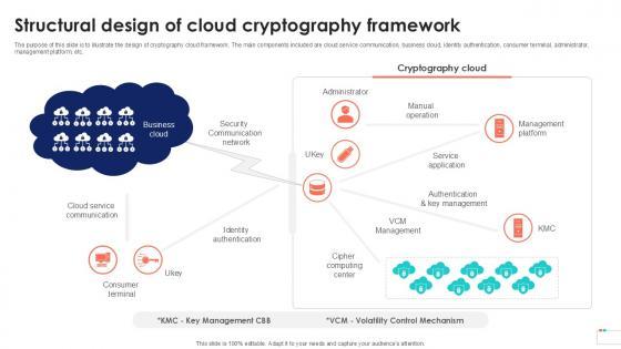 The purpose of this slide is to illustrate the design of cryptography cloud framework. The main components included are cloud service communication, business cloud, identity authentication, consumer terminal, administrator, management platform, etc. From laying roadmaps to briefing everything in detail, our templates are perfect for you. You can set the stage with your presentation slides. All you have to do is download these easy-to-edit and customizable templates. Structural Design Of Cloud Cryptography Data Security In Cloud Computing Ppt Sample will help you deliver an outstanding performance that everyone would remember and praise you for. Do download this presentation today. The purpose of this slide is to illustrate the design of cryptography cloud framework. The main components included are cloud service communication, business cloud, identity authentication, consumer terminal, administrator, management platform, etc.