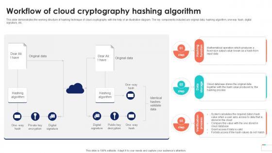 This slide represents the hashing algorithm for cloud cryptography. The purpose of this slide is to discuss about the basic concept of hashing technique used to secure the data present in cloud. The key components included are plain text and hash function. If your project calls for a presentation, then Slidegeeks is your go-to partner because we have professionally designed, easy-to-edit templates that are perfect for any presentation. After downloading, you can easily edit Cloud Cryptography Implementation Data Security In Cloud Computing Ppt Template and make the changes accordingly. You can rearrange slides or fill them with different images. Check out all the handy templates This slide represents the hashing algorithm for cloud cryptography. The purpose of this slide is to discuss about the basic concept of hashing technique used to secure the data present in cloud. The key components included are plain text and hash function.