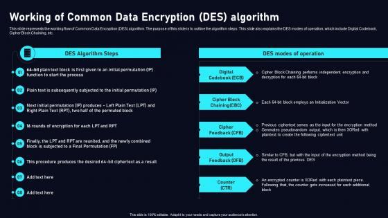 This slide represents the working flow of Common Data Encryption DES algorithm. The purpose of this slide is to outline the algorithm steps. This slide also explains the DES modes of operation, which include Digital Codebook, Cipher Block Chaining, etc. Boost your pitch with our creativeWorking Of Common Data Encryption Cloud Data Security Using Cryptography Demonstration Pdf. Deliver an awe inspiring pitch that will mesmerize everyone. Using these presentation templates you will surely catch everyones attention. You can browse the ppts collection on our website. We have researchers who are experts at creating the right content for the templates. So you do not have to invest time in any additional work. Just grab the template now and use them. This slide represents the working flow of Common Data Encryption DES algorithm. The purpose of this slide is to outline the algorithm steps. This slide also explains the DES modes of operation, which include Digital Codebook, Cipher Block Chaining, etc.