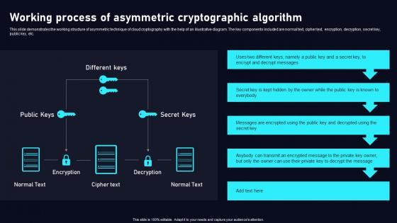 This slide demonstrates the working structure of asymmetric technique of cloud cryptography with the help of an illustrative diagram. The key components included are normal text, cipher text, encryption, decryption, secret key, public key, etc. Slidegeeks is one of the best resources for PowerPoint templates. You can download easily and regulateWorking Process Of Asymmetric Cloud Data Security Using Cryptography Demonstration Pdf for your personal presentations from our wonderful collection. A few clicks is all it takes to discover and get the most relevant and appropriate templates. Use our Templates to add a unique zing and appeal to your presentation and meetings. All the slides are easy to edit and you can use them even for advertisement purposes. This slide demonstrates the working structure of asymmetric technique of cloud cryptography with the help of an illustrative diagram. The key components included are normal text, cipher text, encryption, decryption, secret key, public key, etc.