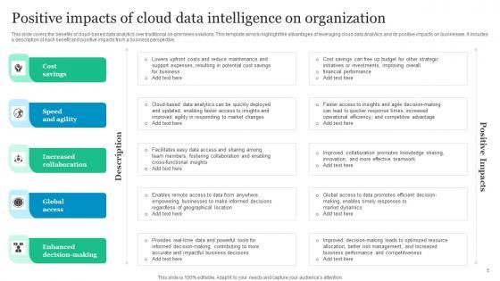 This slide covers the benefits of cloud based data analytics over traditional on premises solutions. This template aims to highlight the advantages of leveraging cloud data analytics and its positive impacts on businesses. It includes a description of each benefit and positive impacts from a business perspective. Pitch your topic with ease and precision using this Positive Impacts Of Cloud Data Intelligence On Organization Demonstration Pdf. This layout presents information on Increased Collaboration, Global Access, Enhanced Decision Making. It is also available for immediate download and adjustment. So, changes can be made in the color, design, graphics or any other component to create a unique layout. This slide covers the benefits of cloud based data analytics over traditional on premises solutions. This template aims to highlight the advantages of leveraging cloud data analytics and its positive impacts on businesses. It includes a description of each benefit and positive impacts from a business perspective.