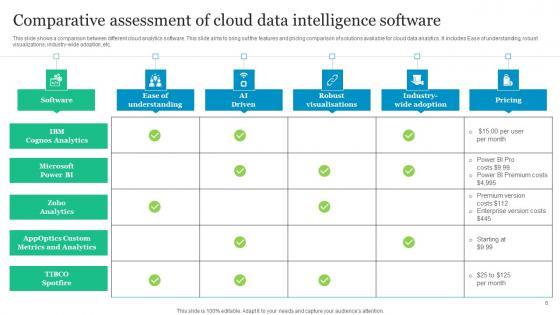 This slide shows a comparison between different cloud analytics software. This slide aims to bring out the features and pricing comparison of solutions available for cloud data analytics. It includes Ease of understanding, robust visualizations, industry wide adoption, etc. Pitch your topic with ease and precision using this Comparative Assessment Of Cloud Data Intelligence Software Slides Pdf. This layout presents information on Comparative Assessment, Cloud Data Intelligence Software. It is also available for immediate download and adjustment. So, changes can be made in the color, design, graphics or any other component to create a unique layout. This slide shows a comparison between different cloud analytics software. This slide aims to bring out the features and pricing comparison of solutions available for cloud data analytics. It includes Ease of understanding, robust visualizations, industry wide adoption, etc.