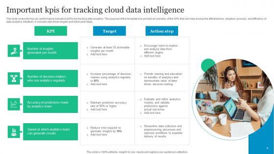 This slide covers the top key performance indicators KPIs for tracking data analytics. The purpose of this template is to provide an overview of the KPIs that can help assess the effectiveness, adoption, accuracy, and efficiency of data analytics initiatives. It includes stat driven targets and actionable steps. Pitch your topic with ease and precision using this Important Kpis For Tracking Cloud Data Intelligence Sample Pdf. This layout presents information on Analytics Regularly, Generate Insights, Optimize Workflows. It is also available for immediate download and adjustment. So, changes can be made in the color, design, graphics or any other component to create a unique layout. This slide covers the top key performance indicators KPIs for tracking data analytics. The purpose of this template is to provide an overview of the KPIs that can help assess the effectiveness, adoption, accuracy, and efficiency of data analytics initiatives. It includes stat driven targets and actionable steps.