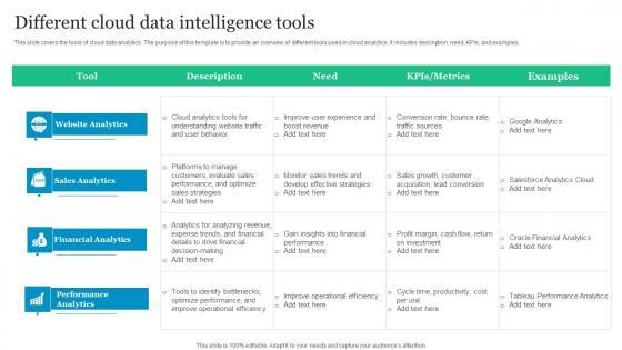 This slide covers the tools of cloud data analytics. The purpose of this template is to provide an overview of different tools used in cloud analytics. It includes description, need, KPIs, and examples. Showcasing this set of slides titled Different Cloud Data Intelligence Tools Themes Pdf. The topics addressed in these templates are Website Analytics, Sales Analytics, Financial Analytics. All the content presented in this PPT design is completely editable. Download it and make adjustments in color, background, font etc. as per your unique business setting. This slide covers the tools of cloud data analytics. The purpose of this template is to provide an overview of different tools used in cloud analytics. It includes description, need, KPIs, and examples.