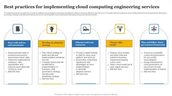 This slide showcases key tactics for smooth and efficient cloud adoption in business operations to enhance resource efficiency and save cost. It includes various practices such as starting with end-to-end assessment, developing an adoption strategy, educating and training resources, choosing right model, planning and following cloud governance framework. Showcasing this set of slides titled Best Practices For Implementing Cloud Computing Engineering Services Clipart Pdf The topics addressed in these templates are Develop An Adoption Strategy, Choose Right Model, Train Resources All the content presented in this PPT design is completely editable. Download it and make adjustments in color, background, font etc. as per your unique business setting. This slide showcases key tactics for smooth and efficient cloud adoption in business operations to enhance resource efficiency and save cost. It includes various practices such as starting with end-to-end assessment, developing an adoption strategy, educating and training resources, choosing right model, planning and following cloud governance framework.